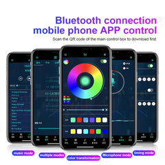 1. Download the application by the QR code on the main control box first, control light mode via Bluetooth connection. This product include 1 main control box ,4 sub control box. Main controller power connect to Acc Fuse, Sub controller power connects to Door power supply.