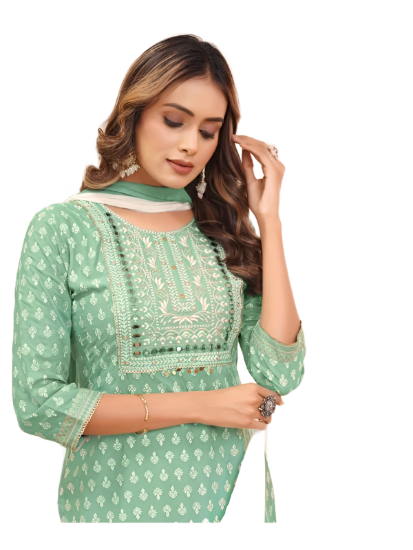 Elevate your ethnic wardrobe with our Designer Printed Kurti adorned with Sequin Embroidery, paired with Pants, Handwork Embellishments, and a Heavy Dyed Chiffon Dupatta. Here's why this ensemble is a must-have for your collection:
