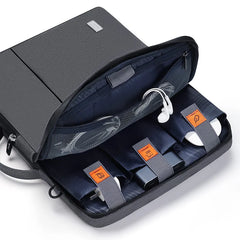 2 secondary compartments: 1 mesh zipper bag, 1 mouse bag, 1 power bag, 1 power bank bag, and 2 front zipper bags.