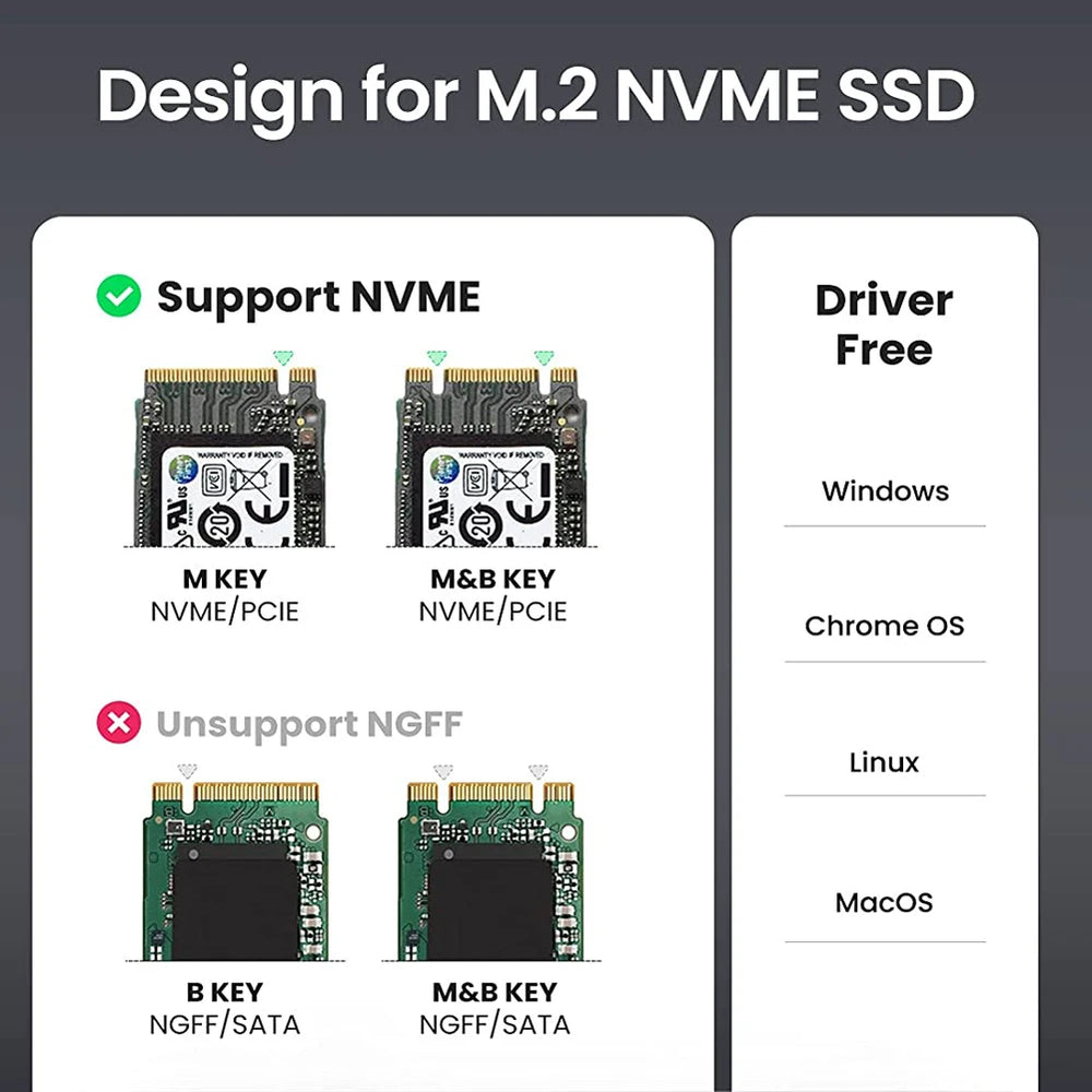 Compatibility: The enclosure is compatible with M.2 NVMe PCIe SSDs, which are widely used for high-speed data storage in laptops, desktops, and other devices. It supports M-Key NVMe PCIe SSDs, ensuring broad compatibility with various SSD models.