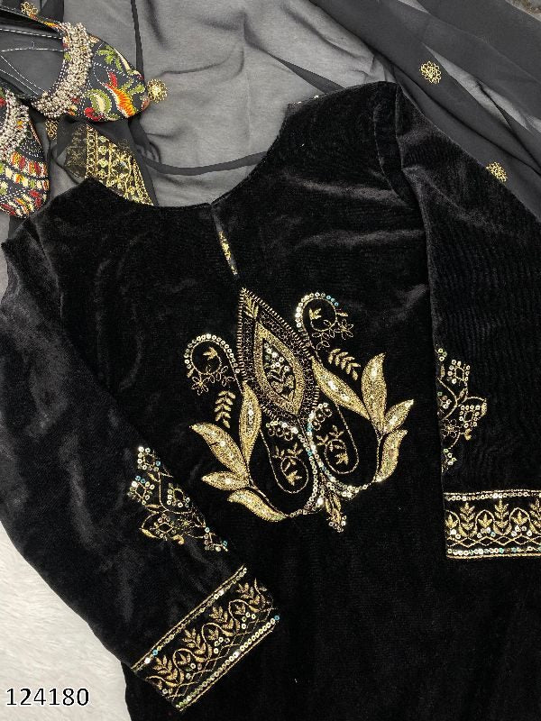 Make your winter season functions truly unforgettable with our exquisite Velvet Sequence Embroidery Work Top with Pant and Dupatta ensemble. Here's why this outfit is the perfect choice for your special occasions: